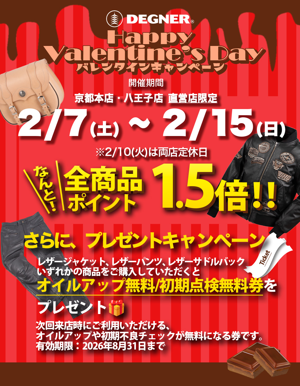 皆さま、こんにちは!デグナー京都本店のえだちゃんです。京都本店&八王子店にて今週土曜日からバレンタインキャンペーンを期間限定にて開催いたします。春のツーリングシーズンに向けてのご準備はこの機会に!