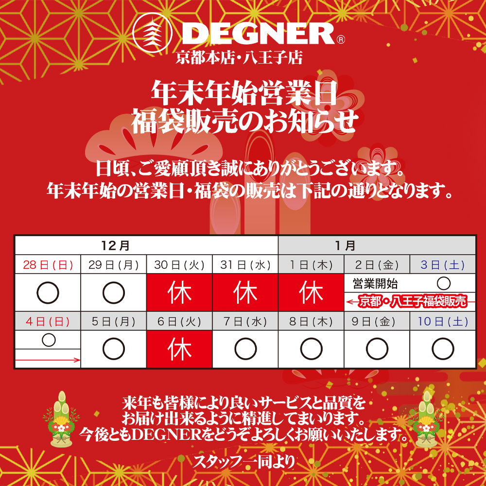 尚、弊社実店舗(京都本店・八王子店)の年末年始の営業日は下記の通りとなります。
