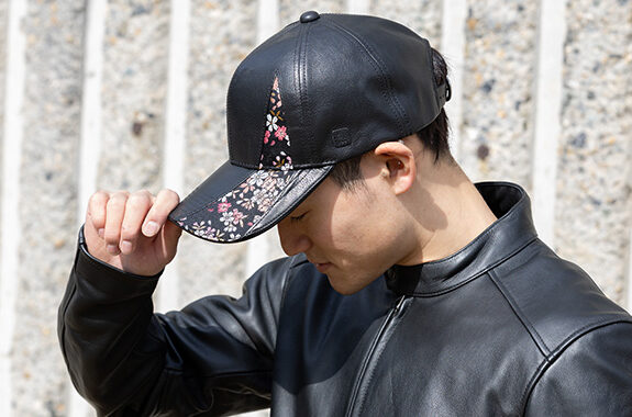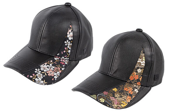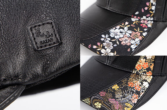 本革を使用したレザーキャップに、煌めく華やかな金襴織物をあしらった。